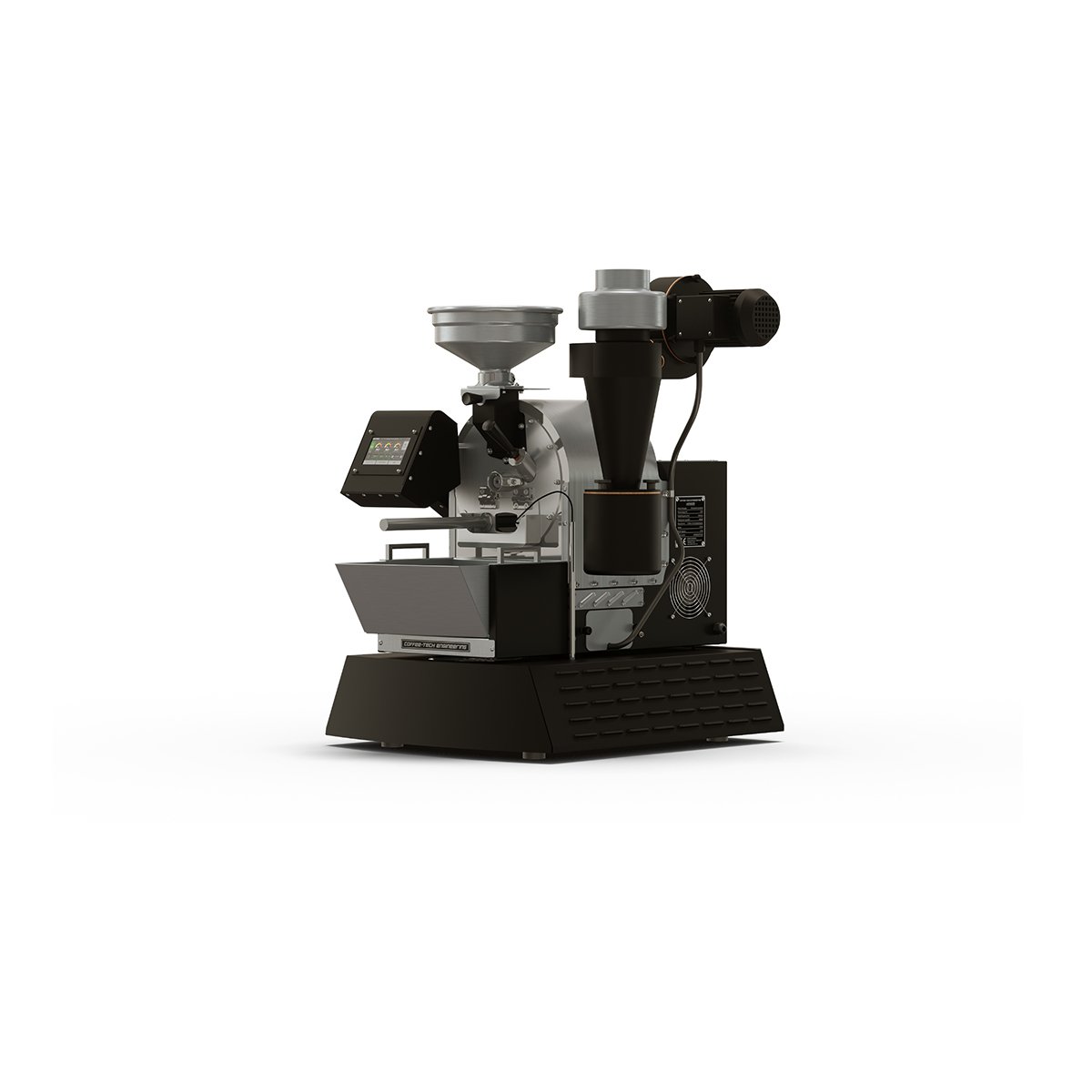 | Chaff Collection Cyclone type chaff collector for roasting and an additional trap box type chaff collector for the cooling | Operation Method Manual or automated, modulated operation of heating elements; digital frequency inverters for controlling convection vs conduction ratio (airflow blower) & drum speed |